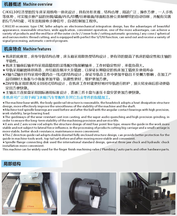 CJK6130经济型数控车床采用机电一体化设计,具有外形美观,结构合理,用途广泛,操作方便,一人多机等到优势,可实现多种产品的外圆/端面/内孔/切槽/任意锥面/球面和各种公英制螺纹的自动切削,并配有完善的S/T/M功能,可发出和接收多种信号,自动控制加工程序 特点 ★机床的底座宽,床身导轨结构合理,床头箱采用散热型结构设计,更有效的提高了机床的稳定性和主轴的平稳性。 ★机床主轴前后轴承均采用高精密的滚珠配对角接触轴承,工作时稳定性好,承载负荷大。 ★导轨采用耐磨铸铁铸造,并经超音频淬火及精磨,以保证长期稳定的机床加工精度及使用寿命 ★X轴与Z轴丝杆均采用中置四点一线式的结构设计,保证导轨在工作中更加平稳且不受侧力影响,在加工产品切削时大拖板与小拖板更加平稳,抗震性更好,维护更加方便 ★Z向导轨采用双燕尾全封闭式结构设计,在机床工作时能更好地对导轨进行防护,顶尖尾坐前后移动更稳定且方便快捷 ★主轴法兰连接盘采用国际通用标准设计,普通三爪卡盘与液压卡盘安装更加方便快捷 本机床可广泛用于阀门/水暖/汽车零配件及其它五金零件的指精加工。